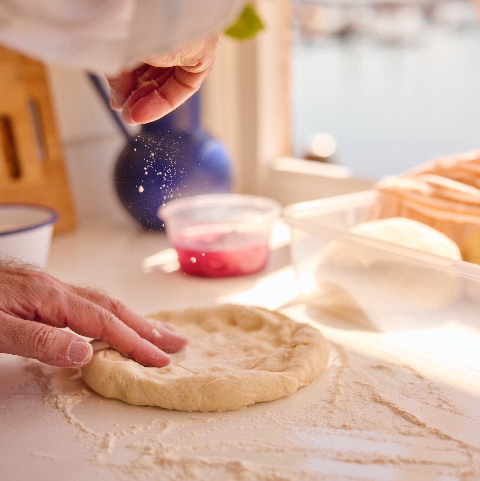 - On a floured surface work the dough balls from the centre and stretch the disc by hand to the desired size